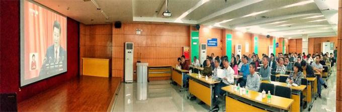 2017年10月18日上午,公司黨委組織黨員干部在公司大樓B幢三樓會議室集中收看習近平同志在中國共產黨第十九次全國代表大會上的報告現場直播,公司黨委書記羅寧,黨委副書記、總經理陳武,黨委副書記、紀委書記葉志超,黨委委員、副總經理黃勵堅等公司領導,各黨總支和黨支部書記、副書記、部長(廠長)助理以上管理人員及職能部門黨員共100多人參加。